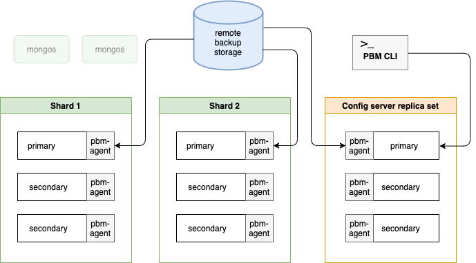 Logical restore is the reverse process: The pbm-agent retrieves the backup data from the storage and inserts it on every primary node in the cluster. The remaining nodes receive the data during the replication process.
